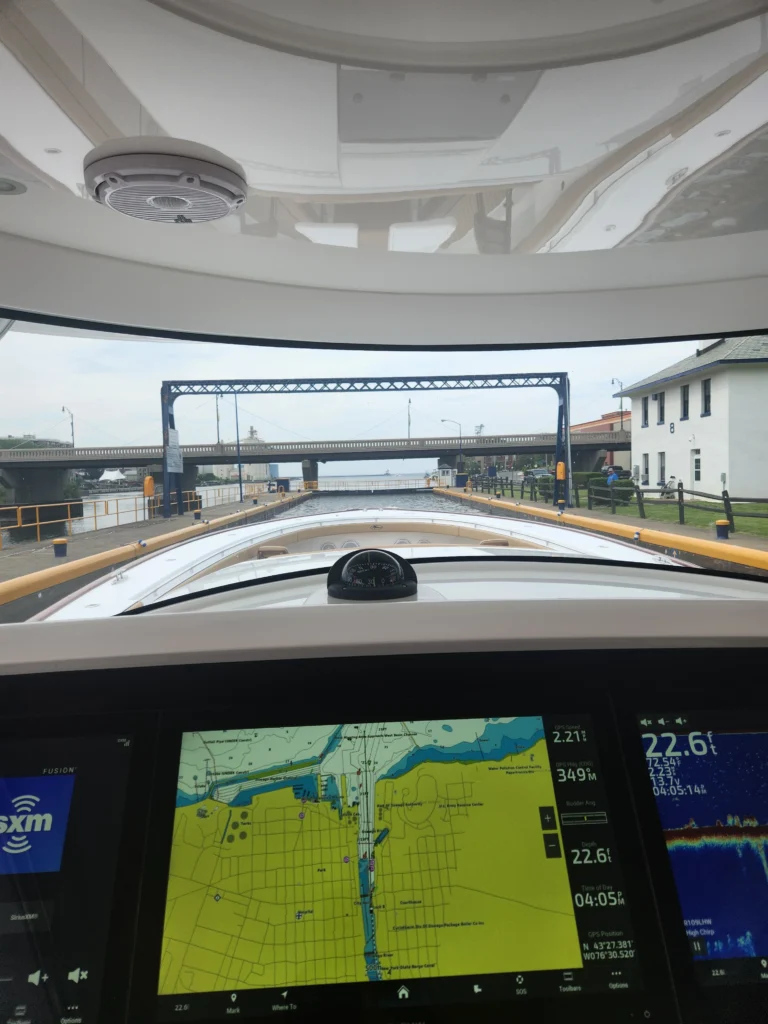 After disembarking in Albany, the boat continued through the Welland Shipping Canal, stopped briefly on Lake St. Clair, cruised up to Mackinaw, and ultimately reached Bay Harbor for the summer season.