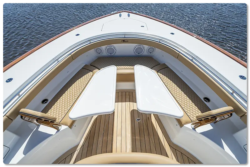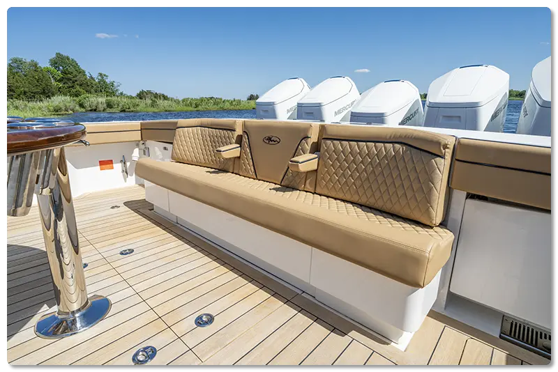 Personalization continued with the second-row seating. Instead of five individual seats, the family worked with Jefferson Beach Yacht Sales and the Valhalla factory team to create a continuous lounger, upholstered in Sunbrella Horizon fabric by Costa Marine.