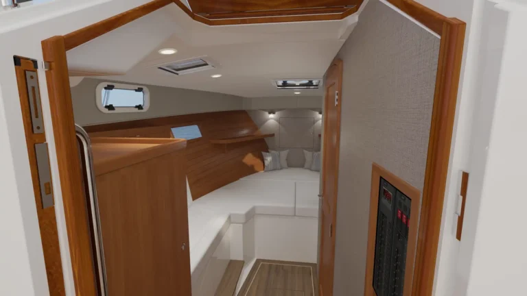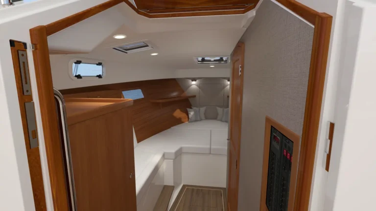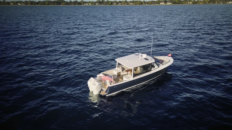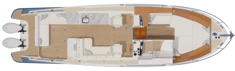 The MJM 38X is the builder’s newly re-named open‑bow, dual‑console day cruiser that pairs Carolina‑Downeast style with modern performance and all‑weather comfort. A protected pilothouse flows to a flush, single‑level deck that links three social zones— the comfortable bow lounge, the pilothouse seating/helm, and the aft cockpit entertainment area. Meanwhile, the compact day‑cabin design adds true weekender flexibility. Created to deliver a swift, soft ride, the 38X brings MJM’s hallmark usability to everything from raft-ups to multi-night, on-water vacations.