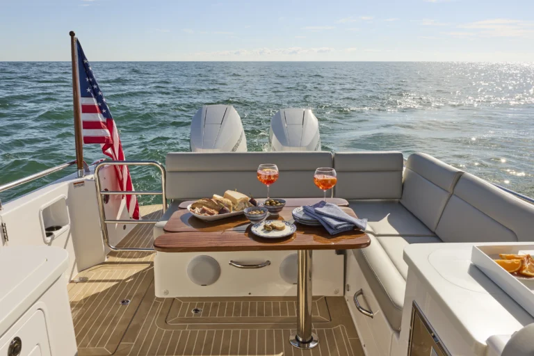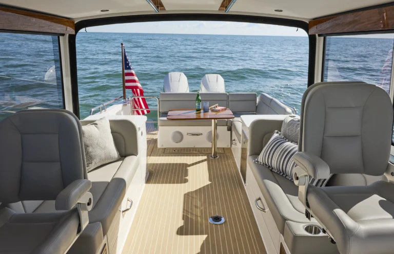 Yacht buyers will appreciate features that make operating the 38X easy and days on the water more relaxed; joystick docking with Mercury controls and Skyhook station‑keeping; a side boarding door for safe, level boarding; opening electric windshields and fully opening side windows, plus optional Air-Conditioning/Heat, for comfortable, all‑season boating. The MJM 38X is certified ISO Category B thanks to its build which uses strong, light epoxy‑infused composite and the confident performance of twin Mercury outboards (with some builds upgrading to 400‑hp V10s). Owners will appreciate the shallow draft for beach and sandbar access, and Zipwake interceptor trim control. Add the enclosed head, generous storage, and thoughtful seating, and the 38X stands out as a versatile, family‑friendly day yacht with real range and capability.
