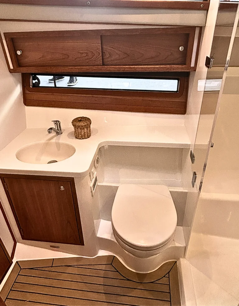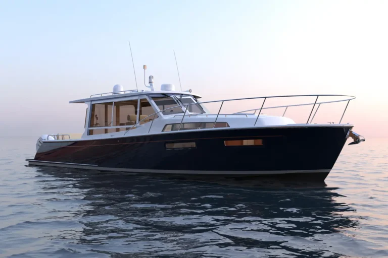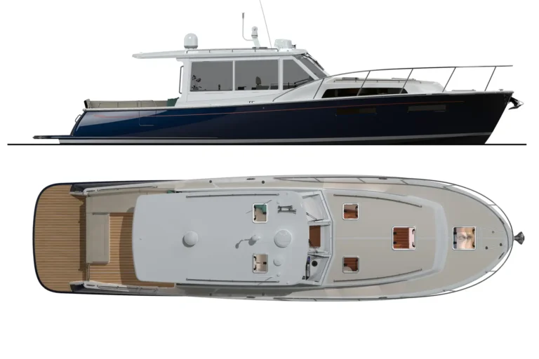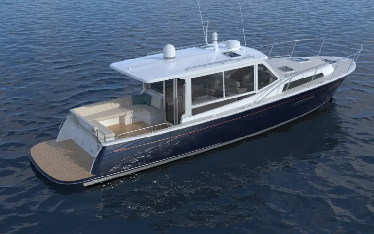 The MJM 47R is a 46'8" Carolina‑Downeast pilothouse cruiser purpose‑built for luxury getaways and long‑range comfort whether adventuring in the Great Lakes or even tackling The Great Loop. Its vacuum‑infused, post‑cured epoxy composite build underpins a quiet, efficient ride, while the indoor/outdoor pilothouse brings all‑weather versatility with an electric opening windshield, sliding side windows, and an aft enclosure. A galley‑up layout keeps the entertainment on deck, and the resort-like interior below offers a large head with separate shower, a queen-sized berth plus a queen berth amidships, and expansive hull windows for natural light. A thoughtful aesthetic adds to the feeling of luxury on board and makes weekend trips feel effortless. The design, which emphasizes stability, allows the 47R get on plane comfortably in the 12-15 knot range.