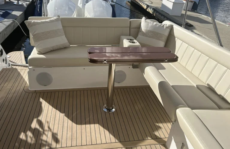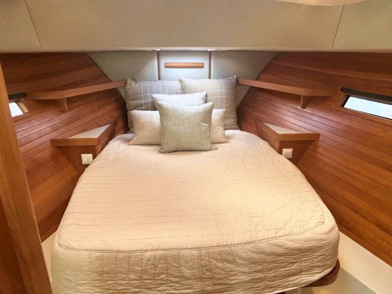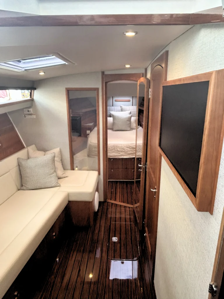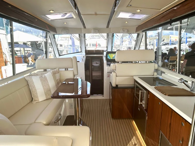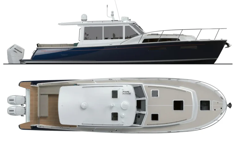 MJM buyers will like the choice of power, which includes either twin Mercury V12 600‑hp outboards (standard) or twin Volvo D6‑440 DPI diesels. The 47R can be pushed to a top-end speed of 55+ mph when equipped with the 600s, plus owner‑operator ease from joystick docking (Mercury Skyhook® or Volvo DPS), bow thruster, and an available Seakeeper 6. Practical cruising features include a 475-gallon fuel capacity on the outboard version (350 gallons with diesel), 110‑gal water, multi‑zone A/C, and an 11 kW genset (OB), while a hullside boarding door, transom entry, and a shallow draft make beach days and docking at marinas simple. With its opening side windows, U‑shaped dining lounge, and refined fit-and-finish, the 47R blends speed, range, and true comfort in a package that is easy to run and easy to love.