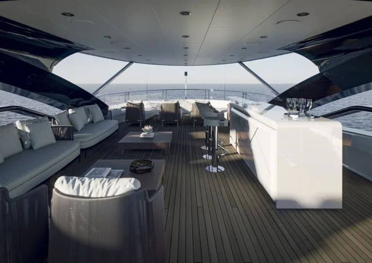 Exterior living has been reimagined with vast, customisable spaces. From the sweeping aft cockpit and upper deck to the flybridge, owners may choose to incorporate indulgent features such as a spa tub or a second helm. The aft lower deck delivers an extraordinary connection to the sea, where extended seating areas and an expansive bathing platform form a luxurious waterside retreat.