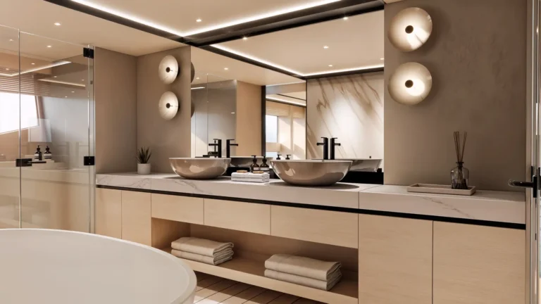 At the heart of the yacht lies a forward main deck master suite, a sanctuary of privacy and refinement, available with an optional his and hers en-suite. Five beautifully appointed guest cabins ensure accommodation for ten, while discreet crew quarters with direct galley access allow for seamless service.