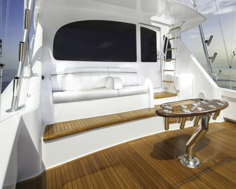 The cockpit sole is built with a laminated mounting plate for fighting chair, rocket launcher or table installations. Standard cockpit equipment includes flush-mounted rod holders; a side locker for gaffs; a walk-through transom door with lift gate; rounded coamings and toekick space for comfort and balance; and fresh and seawater wash downs.