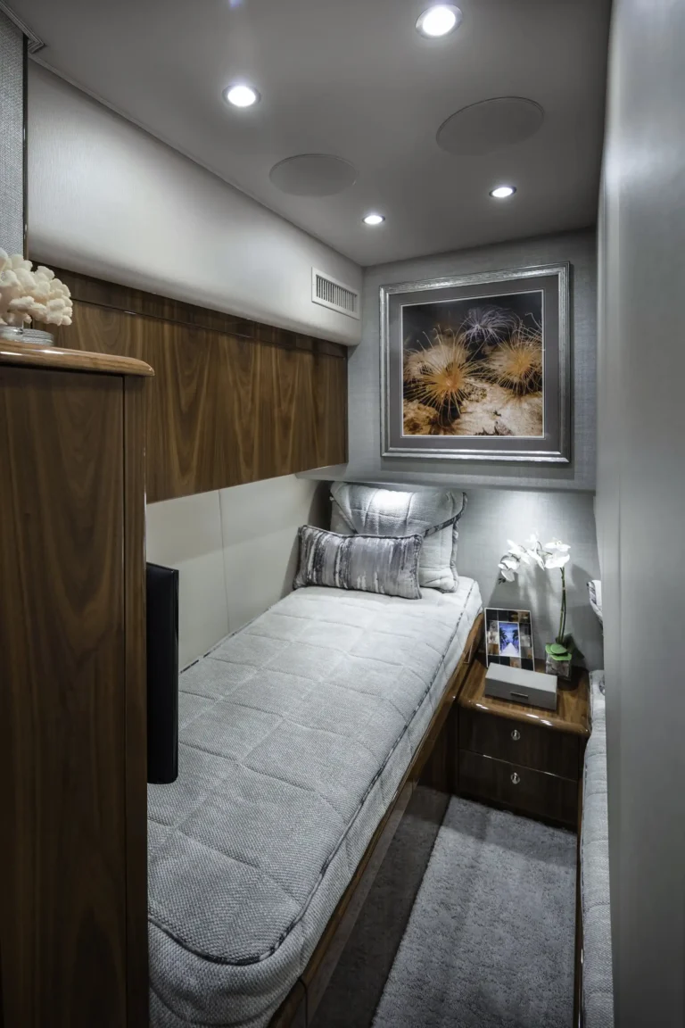 In the starboard stateroom, you have side-by-side bunks, a maple-lined hanging locker with drawer storage underneath. An optional HD TV can be installed in both guest suites.