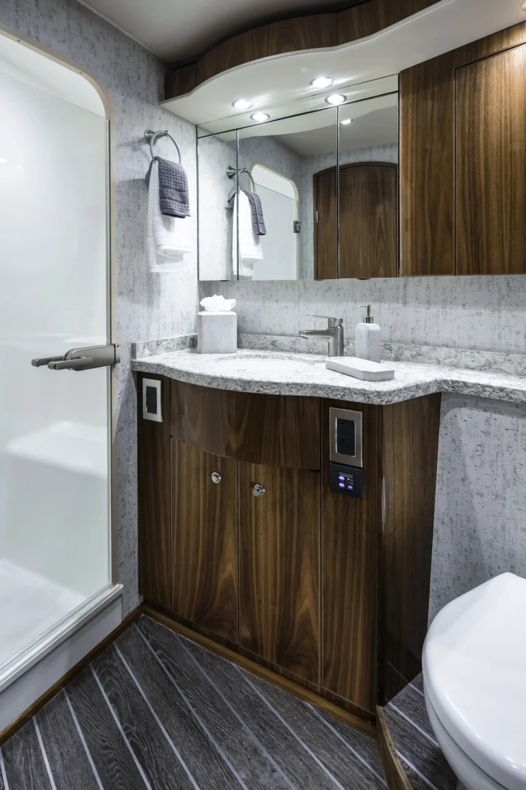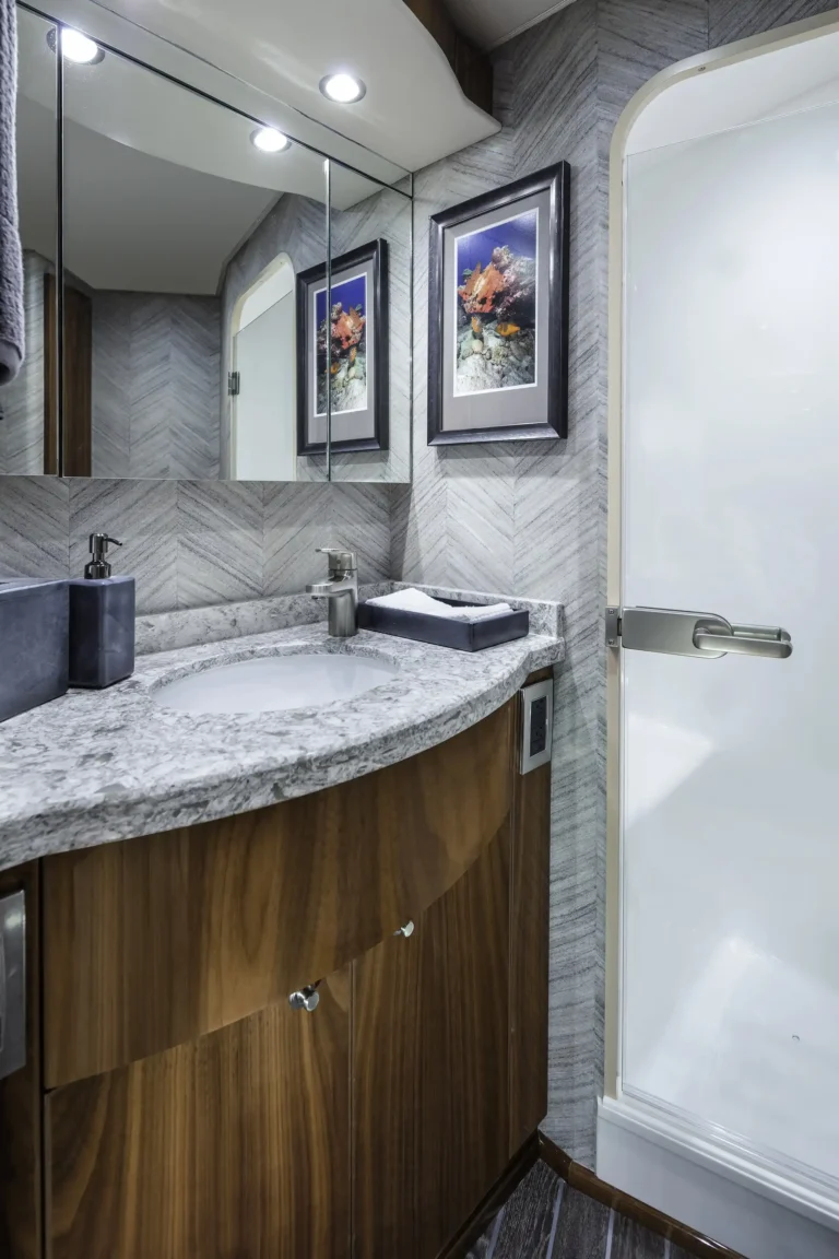 The master and guest heads feature Amtico flooring, electric heads, engineered stone countertops and satin nickel hardware. There’s storage in the lower vanity, and the upper vanity includes a mirrored medicine cabinet with doors. The beautifully finished enclosed showers also have satin nickel fixtures and are equipped with a drain that leads to an automatic sump pump in the bilge.