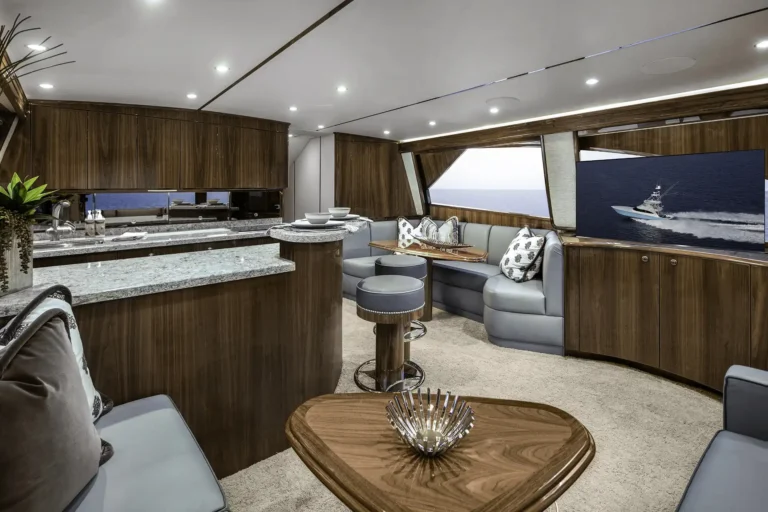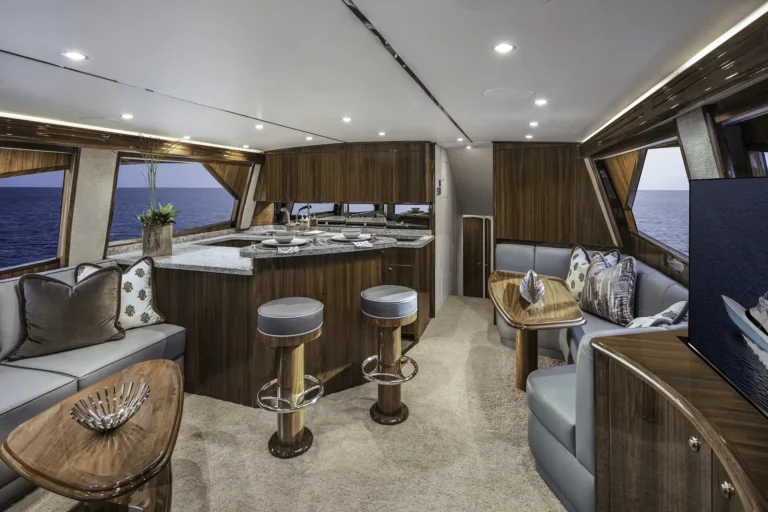 A comfortable place to take in the action without interfering with the anglers, the observation mezzanine has Sunbrella covered cushions with an armrest that holds a pair of drink holders. The port-side seating has an underneath freezer with cooler space on the step below. The centerline seating provides access to the engineroom; there’s also a refrigerated drink box undermounted in the step leading to the salon. On the starboard side, you have a tackle cabinet with a push-release door and drawers, as well as an insulated storage box in the step below.