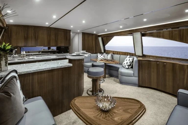 High-gloss teak or walnut are offered for the 58 C’s interior. A satin finish is an option. Privacy and comfort are the hallmarks of every Viking yacht interior, and the salon of the 58 Convertible brings these elements to the next level by providing three unique living and entertaining areas. After a day of patrolling the canyons for billfish and tuna, the port-side L-shaped lounge (with underneath storage), which faces the starboard-side HD TV that rises from the starboard-side cabinetry, is a wonderful place to relax and plan tomorrow’s adventures. A hi-lo mappa burl cocktail table is standard and adds versatility to the space.