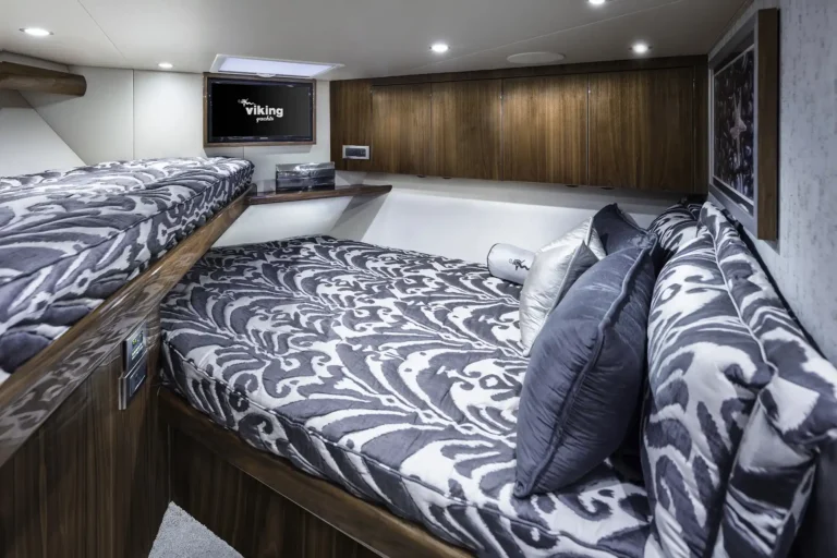 As you would expect from Viking, the master suite is especially spacious and elegant with an athwartship queen walk-around bed and upholstered headboard that faces an HD TV mounted on the inboard bulkhead. Storage includes a credenza, drawers under the bed, end tables, and his and her maple-lined hanging lockers.