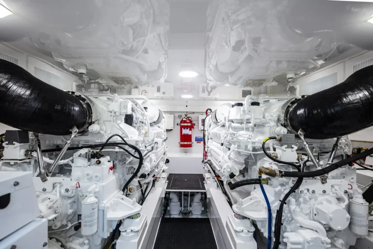 The 58 C maintains Viking’s reputation for engineroom excellence with top-shelf machinery and industry-leading design and engineering. Systems include Delta-T ventilation and water suppression; automatically or manually operated fire suppression tied into the main engine and generator ignitions; integrated engine mounting for efficient transfer of energy to the drive train; and oil changing. Of course, all of these systems are mounted with superb precision and attention to detail in an immaculate engineroom painted with Snow White Awlgrip for visibility and ease of maintenance.