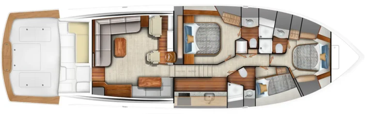 From its commanding helm station to its aggressive, streamlined profile, the 64 Sport Tower was designed for visibility, balance, and offshore confidence. Owners may choose between two layouts: a galley-up configuration with four staterooms and three heads, or a galley-down arrangement that transforms the command deck into a spacious salon-style living area. Both layouts provide smart, comfortable accommodations tailored for extended fishing trips or family cruising.