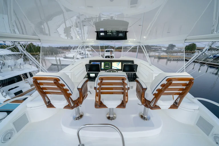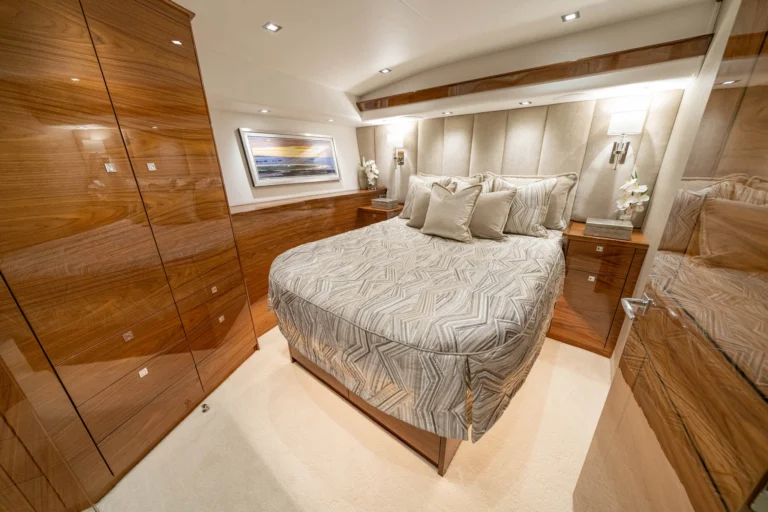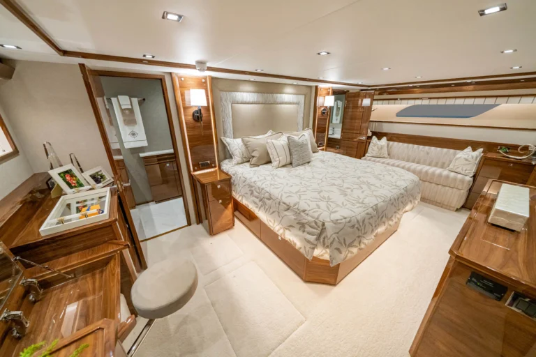 The hallmark of the Convertible design is its expansive open bridge. The 90C features a center console helm with recessed electronics, three teak ladder-back helm chairs, and wraparound lounges forward and to port and starboard. A large freezer, drink boxes, and abundant storage are seamlessly integrated, making the bridge a true command center with visibility and comfort for both captain and guests.