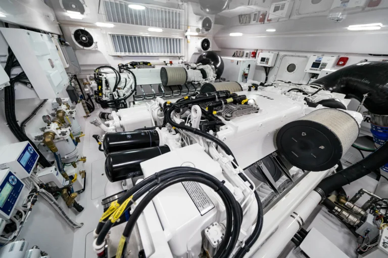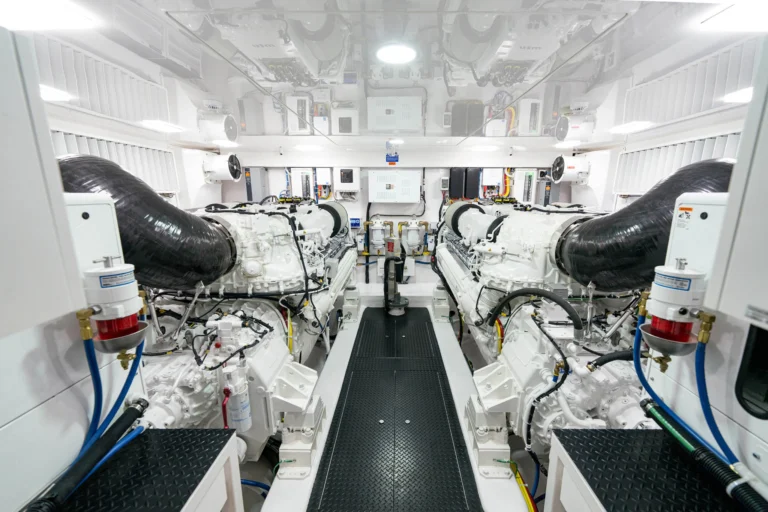 Powered by optional MTU 16V 2000 M96Ls or CAT C32B engines, the Viking 90C runs over 38 knots at top end and cruises efficiently at 32–33 knots with nearly 600 nautical miles of range. A refined hull, advanced propulsion systems, and Computational Fluid Dynamics optimization maximize efficiency, while carbon fiber and Light Resin Transfer Molding deliver strength without added weight. The bright Awlgrip-finished engine room with over seven feet of headroom ensures full access to every major system.